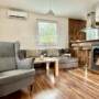 Dom je zariadený v modernom, minimalistickom štýle s dôrazom na priestor a funkčnosť. Použité sú kvalitné materiály vrátane spotrebičov. Interiér pozostáva zo vstupnej chodby, klimatizovanej obývacej izby spojenej s kuchyňou a jedálenskou časťou, odkiaľ sa spojovacou chodbou prechádza do ostatných miestností ako je technická miestnosť, kúpeľňa, samostatná toaleta a tri spálne s výtupom na terasu. Na chodbe je aj výstup na úložnú povalu.